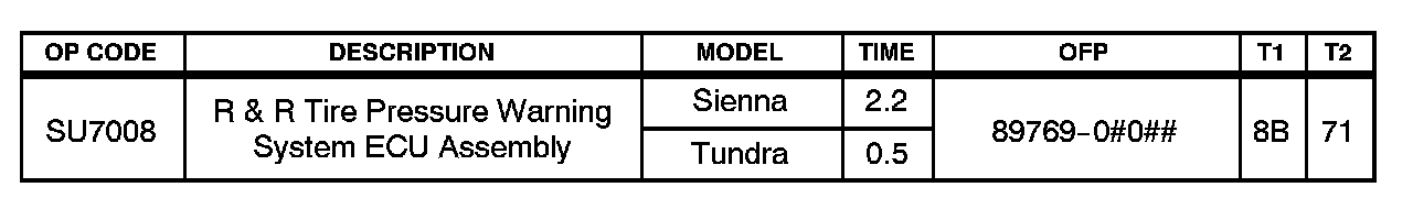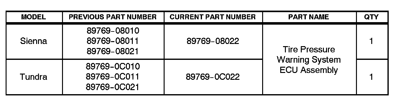 Some 2007 - 2008 model year Sienna and 2007 model year Tundra vehicle customers may complain that the Tire Pressure Warning System (TPWS) Light is "ON" and one or both of the following DTCs are stored in the TPWS ECU.