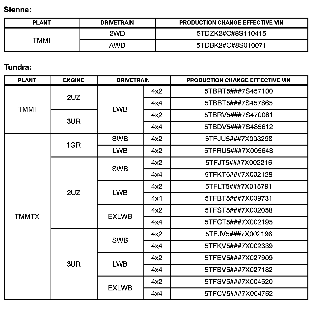 ^ 2007 model year Tundra vehicles produced BEFORE the Production Change Effective VINs shown in this TSB.