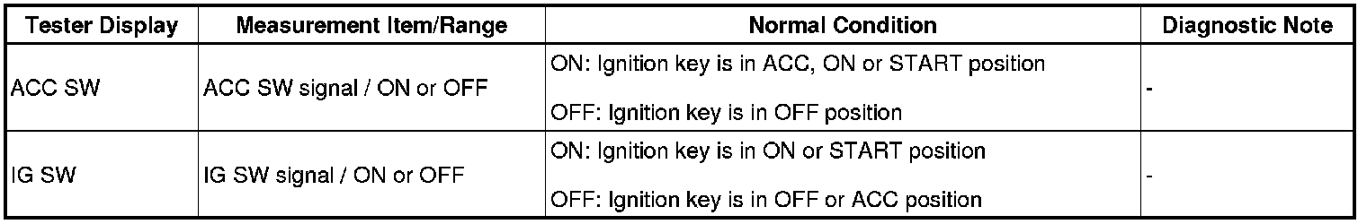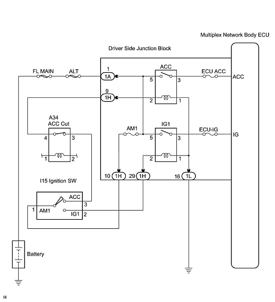 The Multiplex network body ECU receives the ACC and IG signals from the ignition switch.