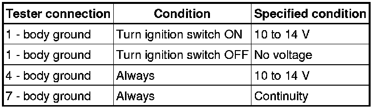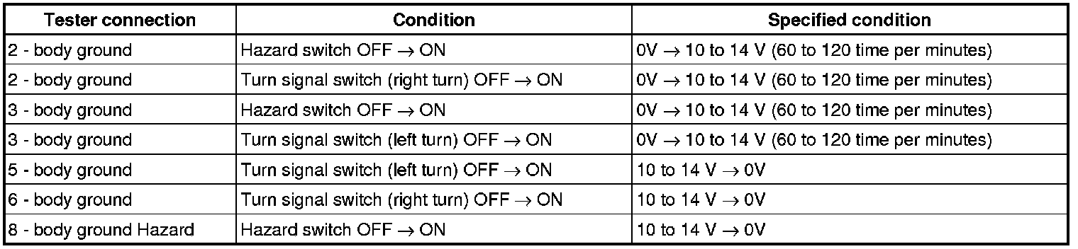 (b) Connect the connector to turn the signal flasher and turn the ignition switch ON, and inspect the wire harness side connector from the back side as shown in the chart.