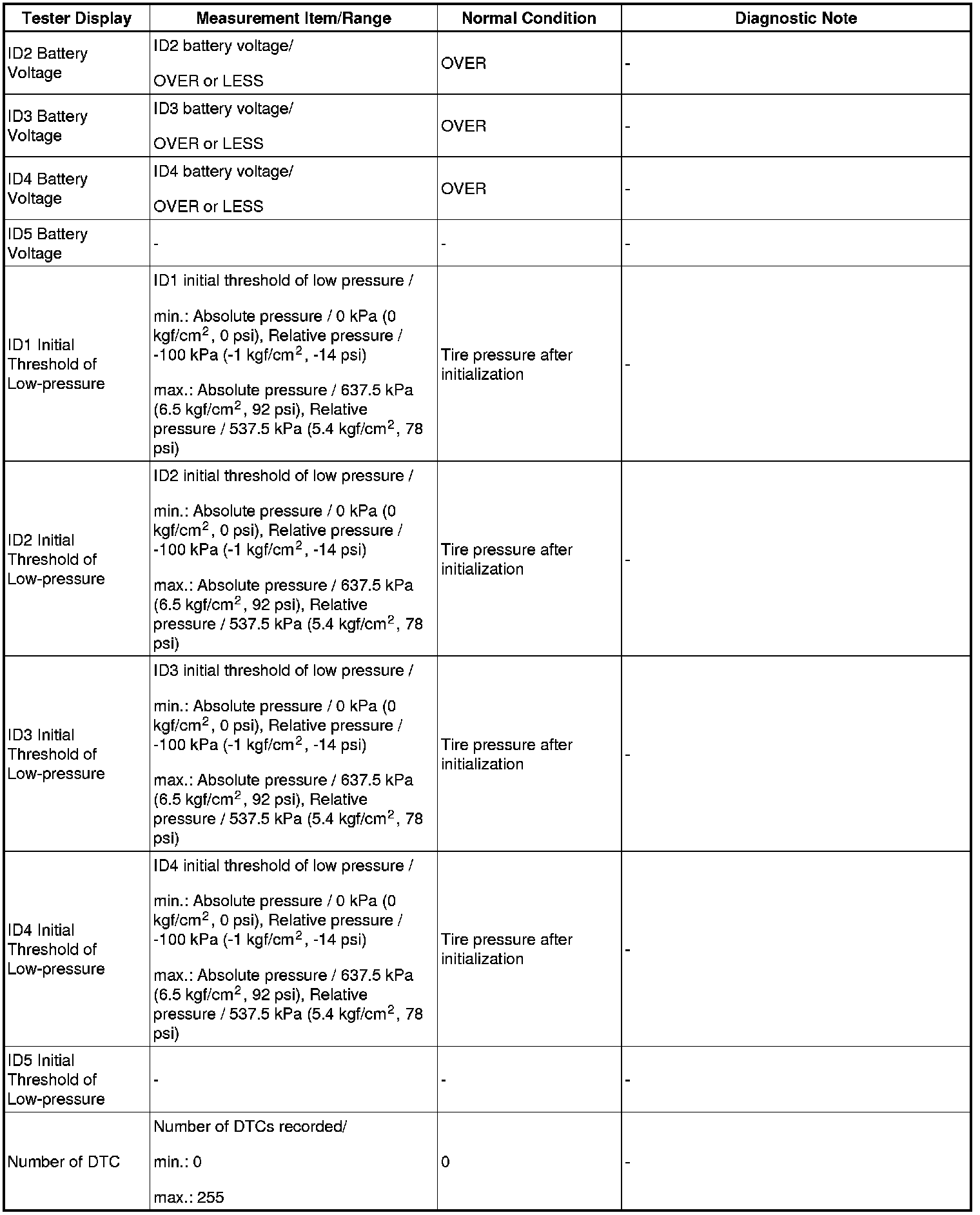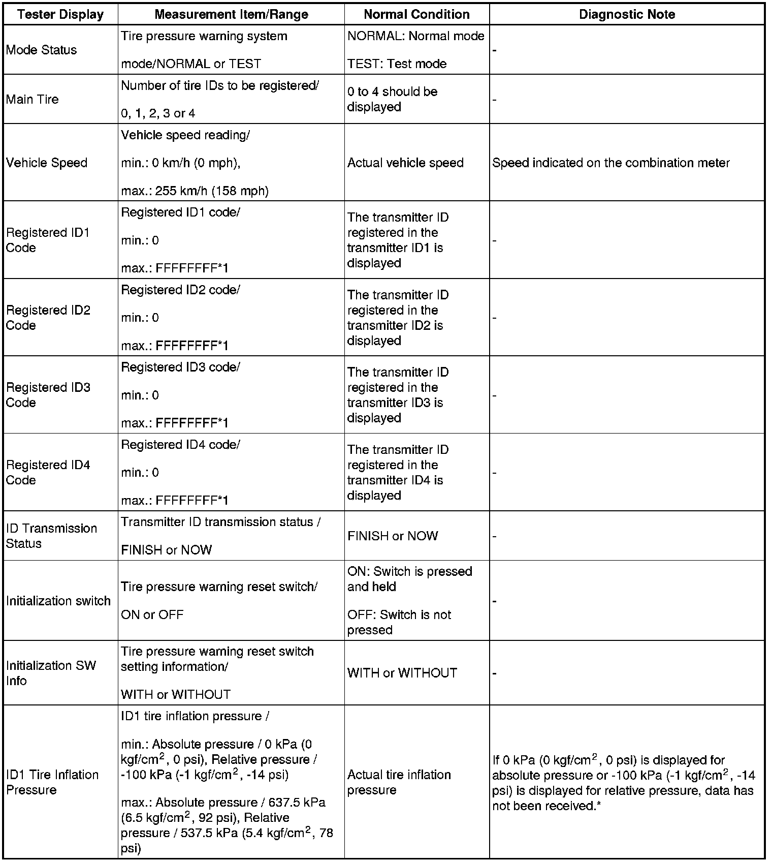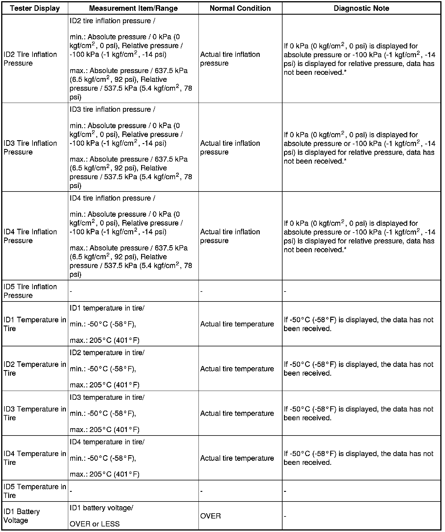 *2: It may take up to about 5 to 6 minutes to update the tire pressure data. If the values are not displayed after about 5 to 6 minutes, perform troubleshooting according to the inspection procedure for DTCs C2121/21 to C2124/24 C2124.