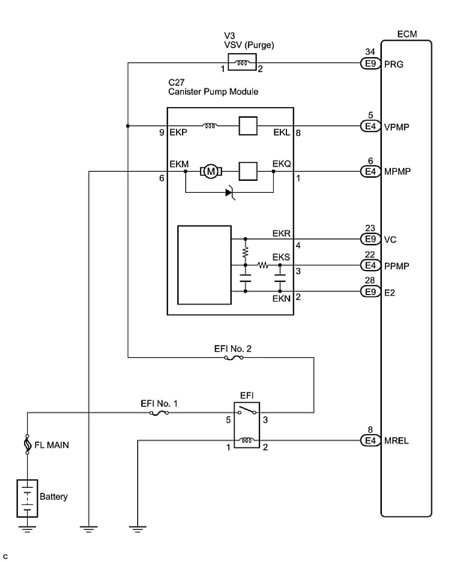 The electric vacuum pump creates negative pressure (vacuum) in the EVAP system, and the pressure is measured. Finally, the ECM monitors for leaks from the EVAP system and malfunctions in both the pump module and purge VSV, based on the EVAP pressure.