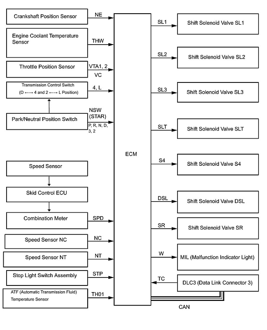 (a) The ECT (Electronic controlled automatic transmission/transaxle) is an automatic transmission/transaxle that electronically controls shift timing using the ECM. The ECM detects electrical signals that indicate engine and driving conditions, and controls the shift point, based on driver habits and road conditions. As a result, fuel efficiency and power transmission performance are improved.