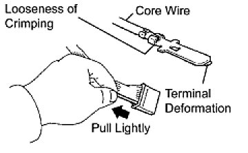 (2) Checking when a connector is disconnected: Check by pulling the wire harness lightly from the backside of the connector. Look for unlatched terminals, missing terminals, loose crimps or broken conductor wires. Check visually for corrosion, metallic or foreign matter and water, and bent, rusted, overheated, contaminated, or deformed terminals.