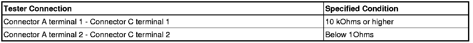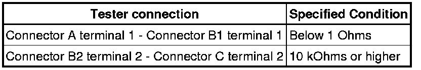 HINT: Measure the resistance while lightly shaking the wire harness vertically and horizontally. If the results match the examples above, an open circuit exists between terminal 1 of connector A and terminal 1 of connector C.