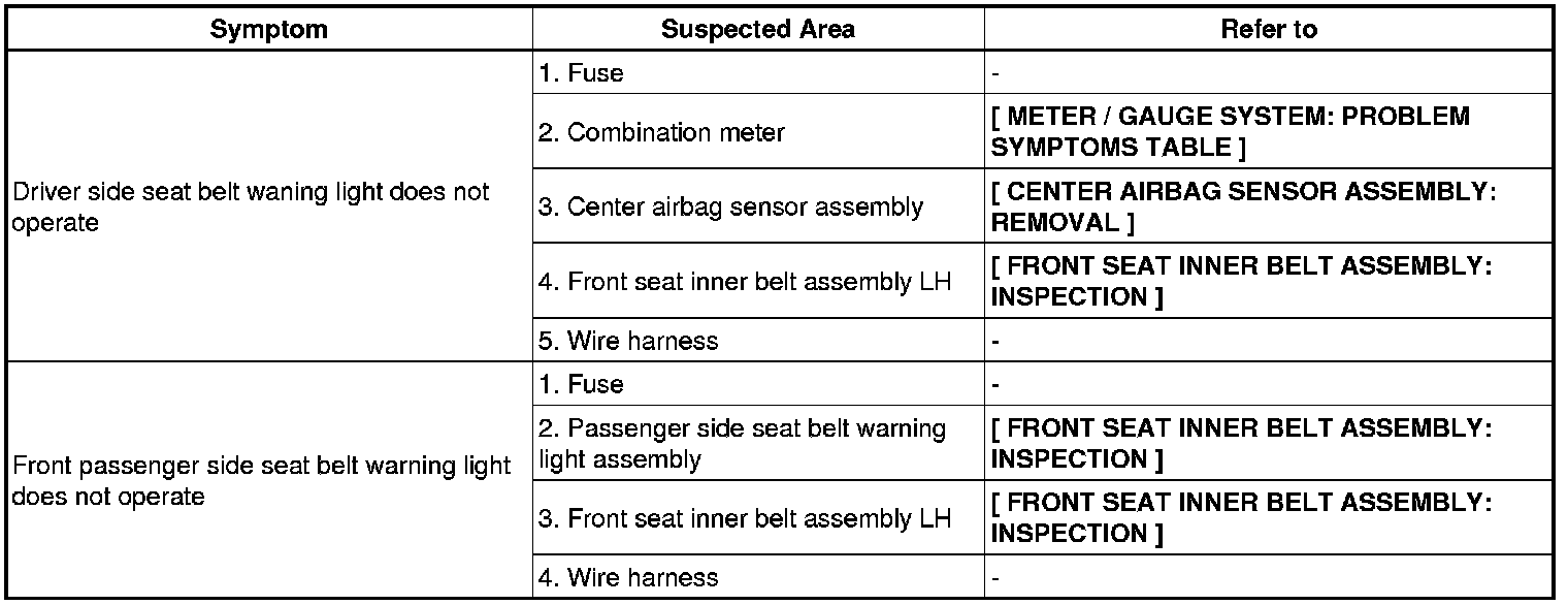 : SEAT BELT WARNING SYSTEM: PROBLEM SYMPTOMS TABLE