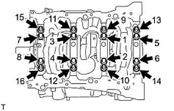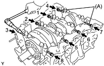 Install 8 new seal washers and uniformly tighten the 8 crankshaft bearing cap bolts in several steps and in the sequence shown in the illustration.