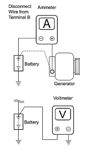 (1) Disconnect the wire from terminal B of the generator, then connect it to the negative (-) lead of an ammeter.