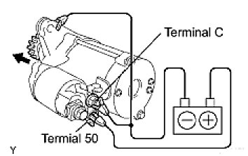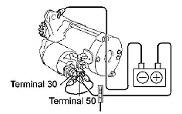 (1) Maintain the battery connections in step (a), but disconnect the negative (-) lead from terminal C. Check that the pinion gear remains extended.