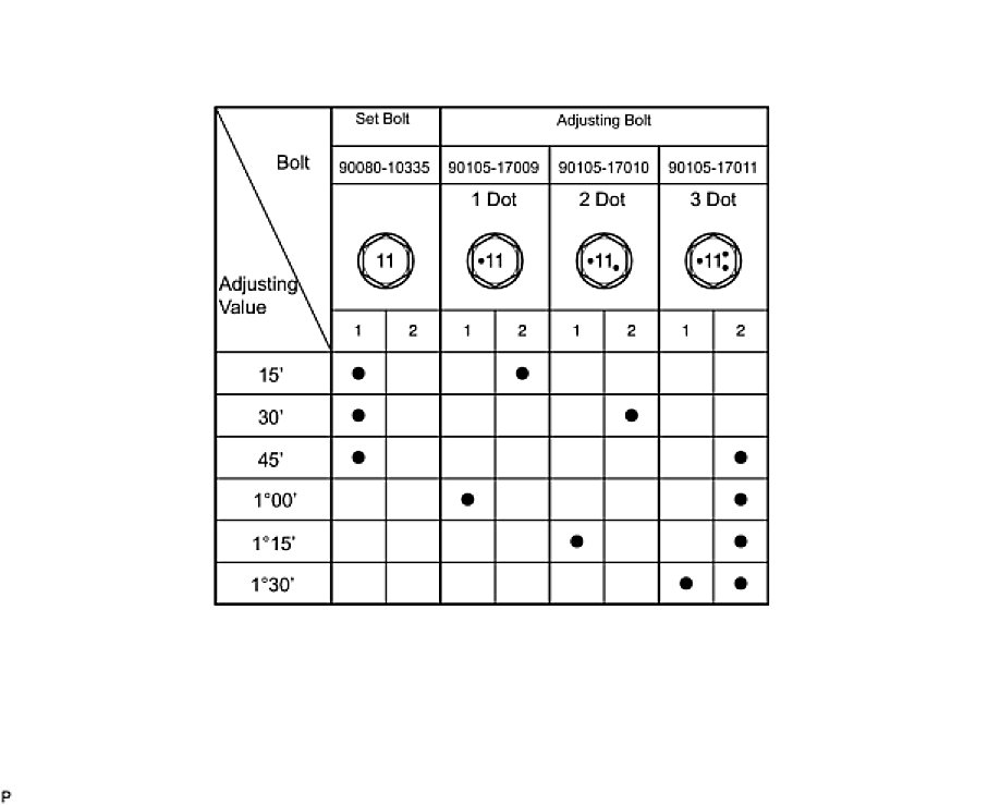 - If the camber is not within the specified value, using the following table, estimate how much additional camber adjustment will be required, and select the camber adjusting bolt.