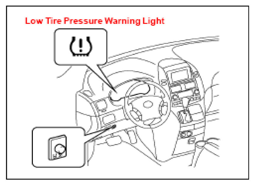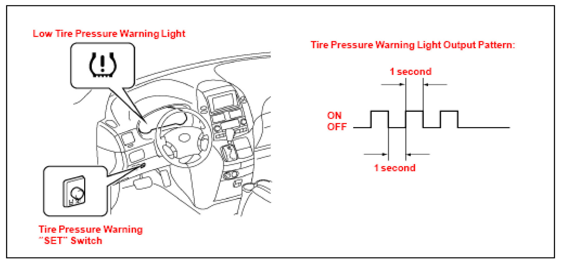 3. Push and hold the Tire Pressure Warning "SET" Switch for 3 seconds until the Low Tire Pressure Warning Light blinks 3 times and then turns OFF, indicating the system is now initialized.