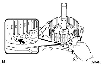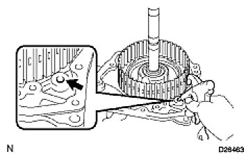 (a) Holding the direct clutch drum by hand, apply compressed air (392 kPa, 4.0 kgf/cm2, 57 psi) to the transaxle rear cover to remove the direct clutch drum.