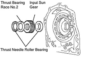 (a) Remove the 2 thrust needle roller bearings, thrust bearing race No.2 and the input sun gear from the transaxle case.