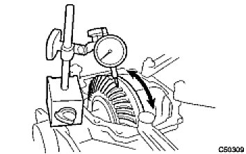 (a) Set the dial gauge perpendicular to the ring gear face, fix the driven pinion, and check backlash by moving the ring gear.