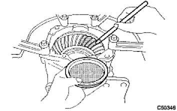 (d) If the preload is insufficient, even though the tightening torque of the transfer gear nut exceeds the maximum of the standard value., loosen the transfer gear nut and apply gear oil SAE 90 (GL-5) to the transfer gear nut and the screw thread and the base of driven pinion. And then repeat the preceding operation. If the tightening torque is bearing spacer with anew one and adjust it.