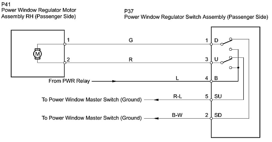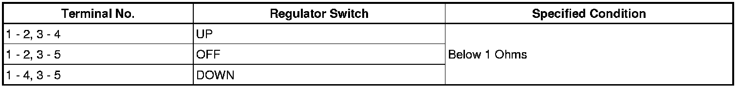 If the manual UP/DOWN function does not operate, the power window motor, the regulator switch or the wire harness may be malfunctioning.