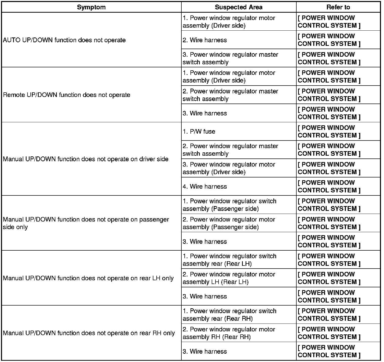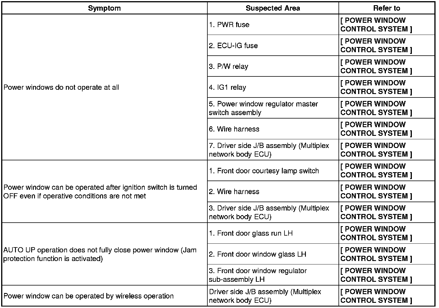 / WINDOWGLASS: POWER WINDOW CONTROL SYSTEM (w/ Jam Protection Function): PROBLEM SYMPTOMS TABLE