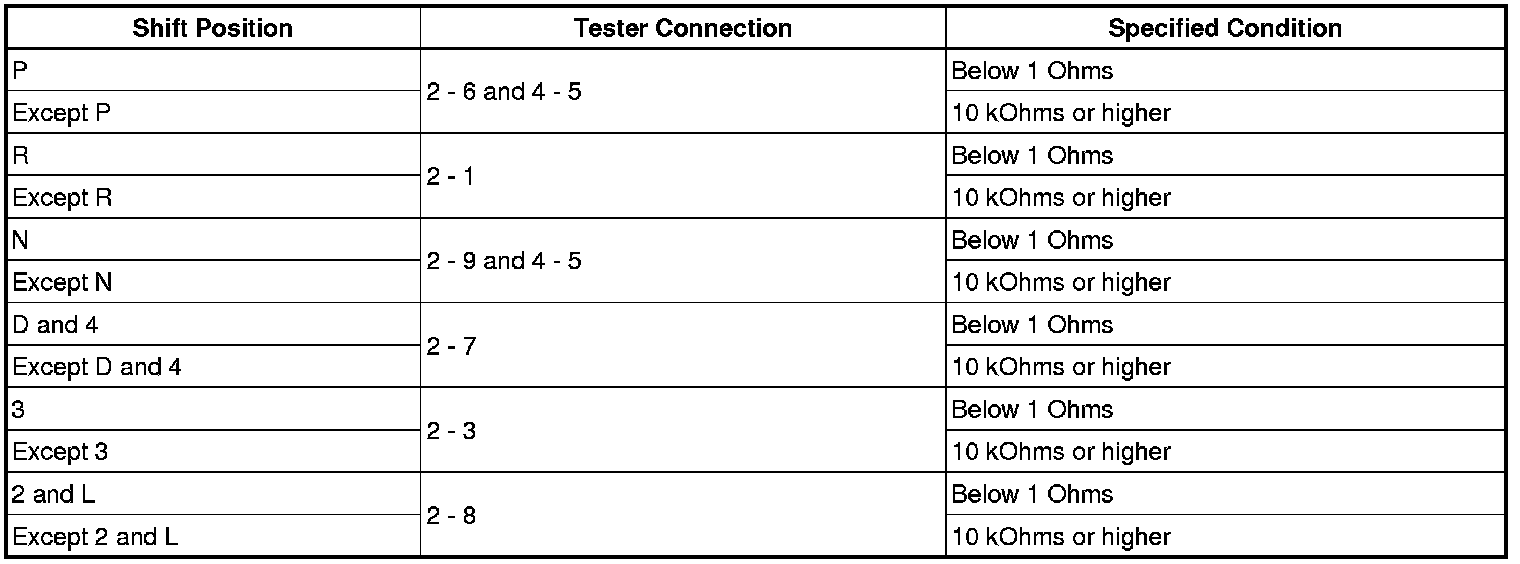 (b) Measure resistance according to the value(s) in the table below when the shift lever is moved to each position.