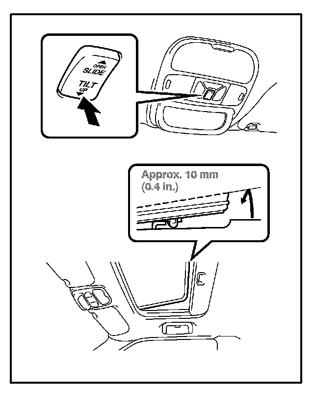 2. Push and hold the TILT UP" side of the switch until the moon roof tilts all the way up and then tilts down slightly (approximately 10 mm [0.4 in.] at rear end).