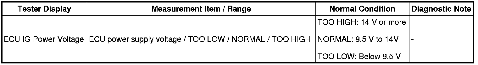 If the voltage supplied to the IG1 terminal is not within the DTC detection threshold due to malfunctions in parts such as the battery and alternator circuit, this DTC is stored.