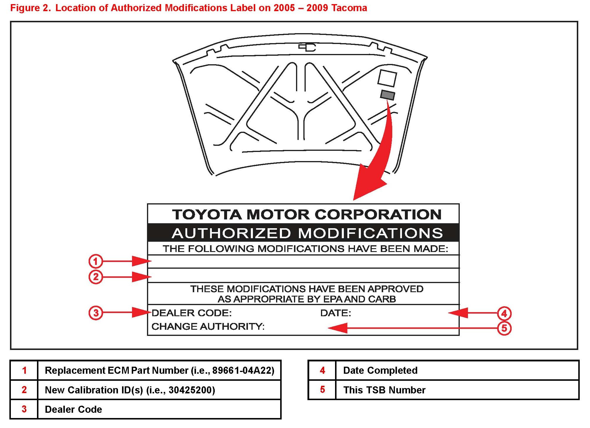 5. Check for the Authorized Modifications Label affixed to the vehicle in the location shown in Figure 2. Confirm if the ECM (PCM) calibration has been updated using Techstream Health Check. If the calibration ID listed is NOT the latest ECM (PCM) calibration - go to step 6.
