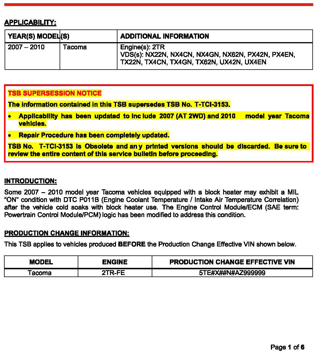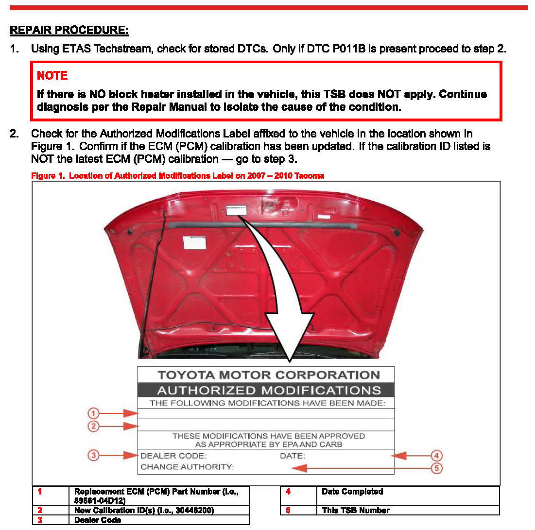 MEL "ON" DTC PO11B WITH BLOCK HEATER INSTALLED ON 2TR-FE ENGINE