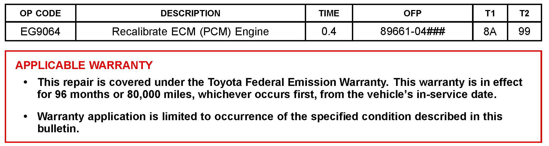 Follow the procedures outlined in TSB No. T-SB-0064-10, "Techstream ECU Flash Reprogramming Procedure", and flash the ECM (PCM) with the NEW calibration file update.