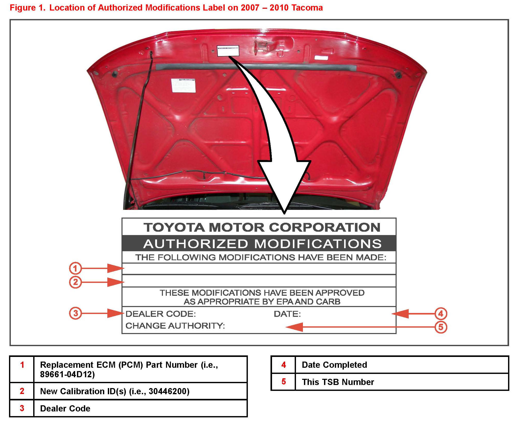 2. Check for the Authorized Modifications Label affixed to the vehicle in the location shown in Figure 1. Confirm if the ECM (PCM) calibration has been updated. If the calibration ID listed is NOT the latest ECM (PCM) calibration - go to step 3.