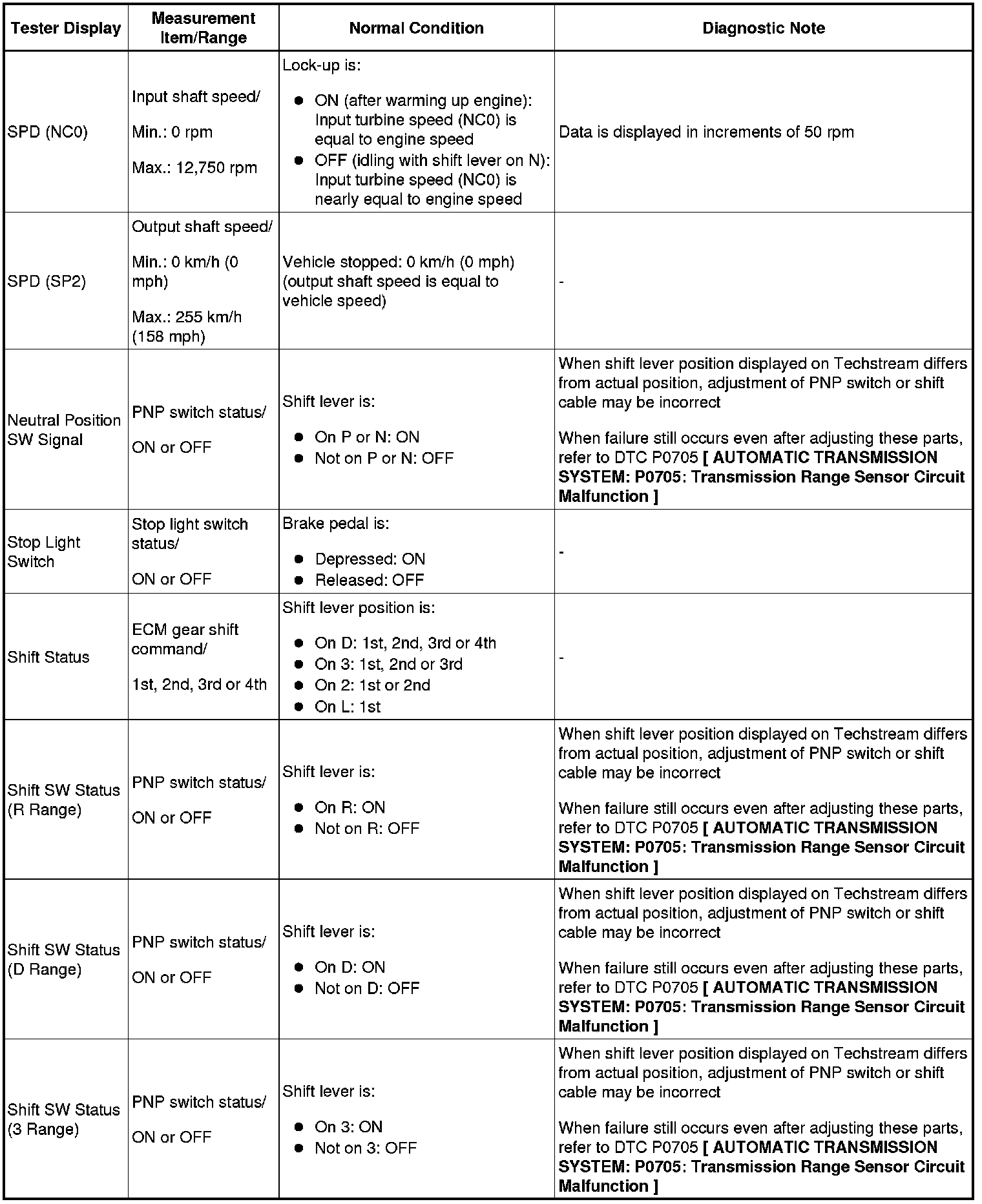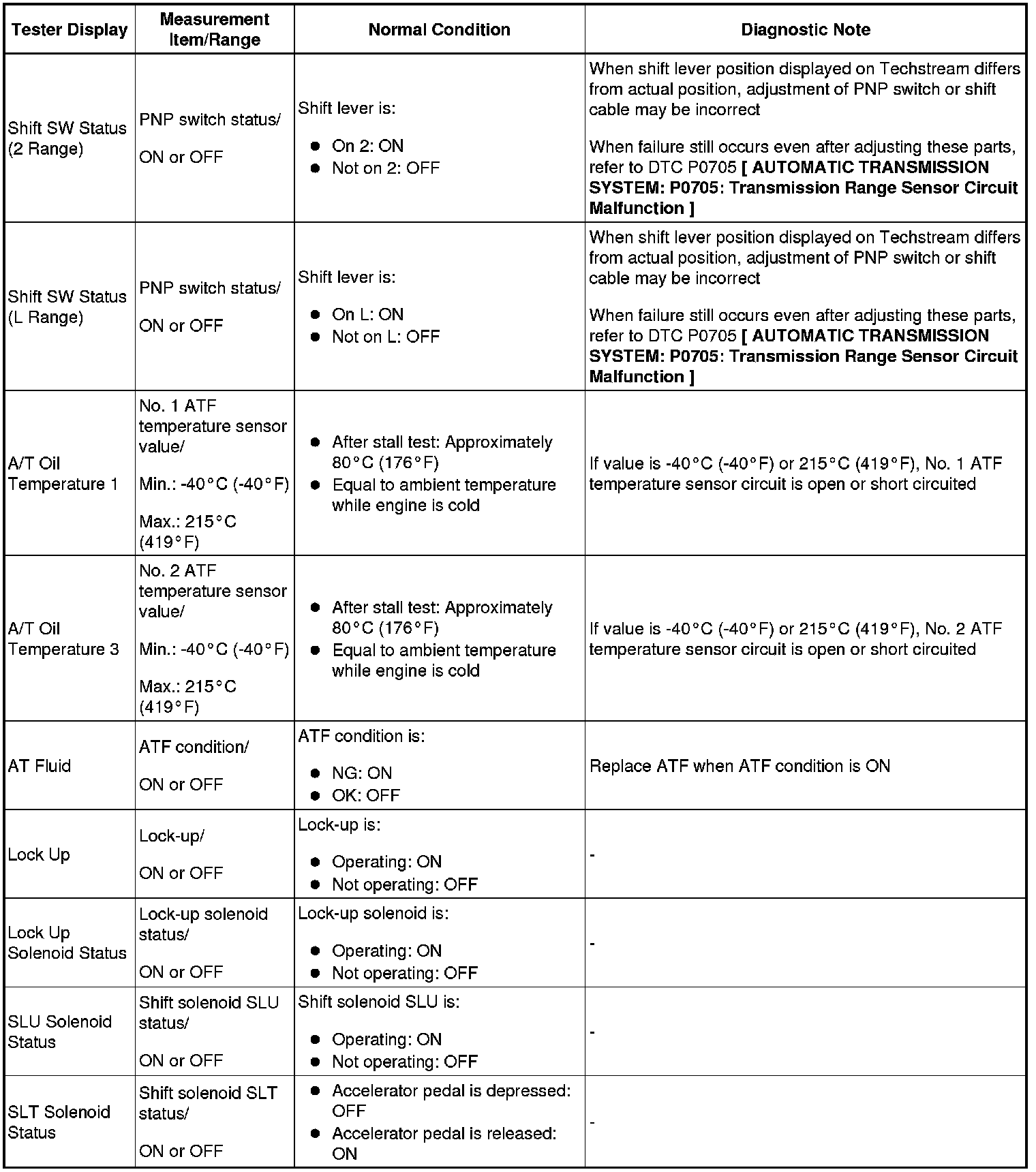 HINT: Using Techstream to read the Data List allows the values or states of switches, sensors, actuators and other items to be read without removing any parts. This non-intrusive inspection can be very useful because intermittent conditions or signals may be discovered before parts or wiring is disturbed. Reading the Data List information early in troubleshooting is one way to save diagnostic time.