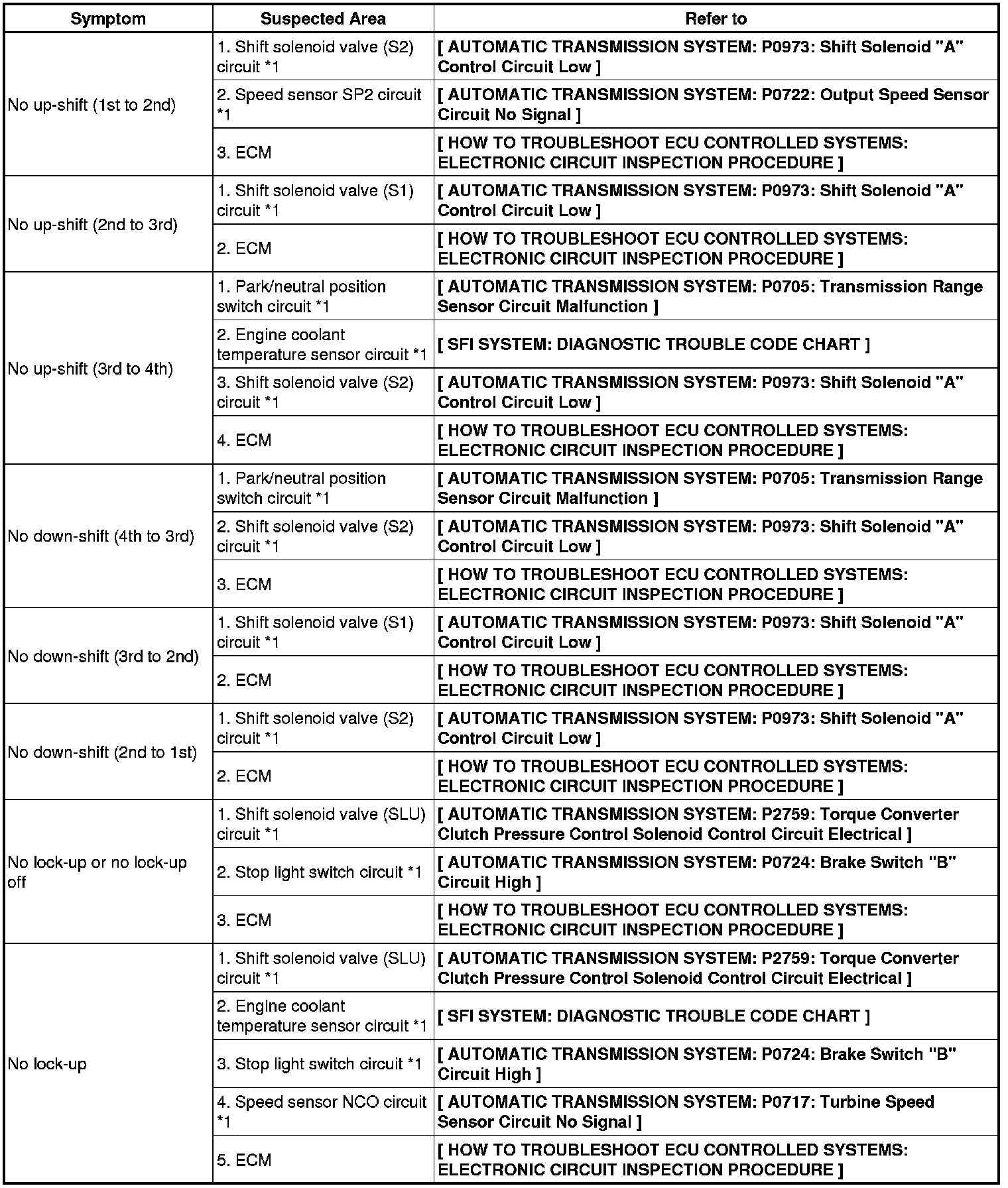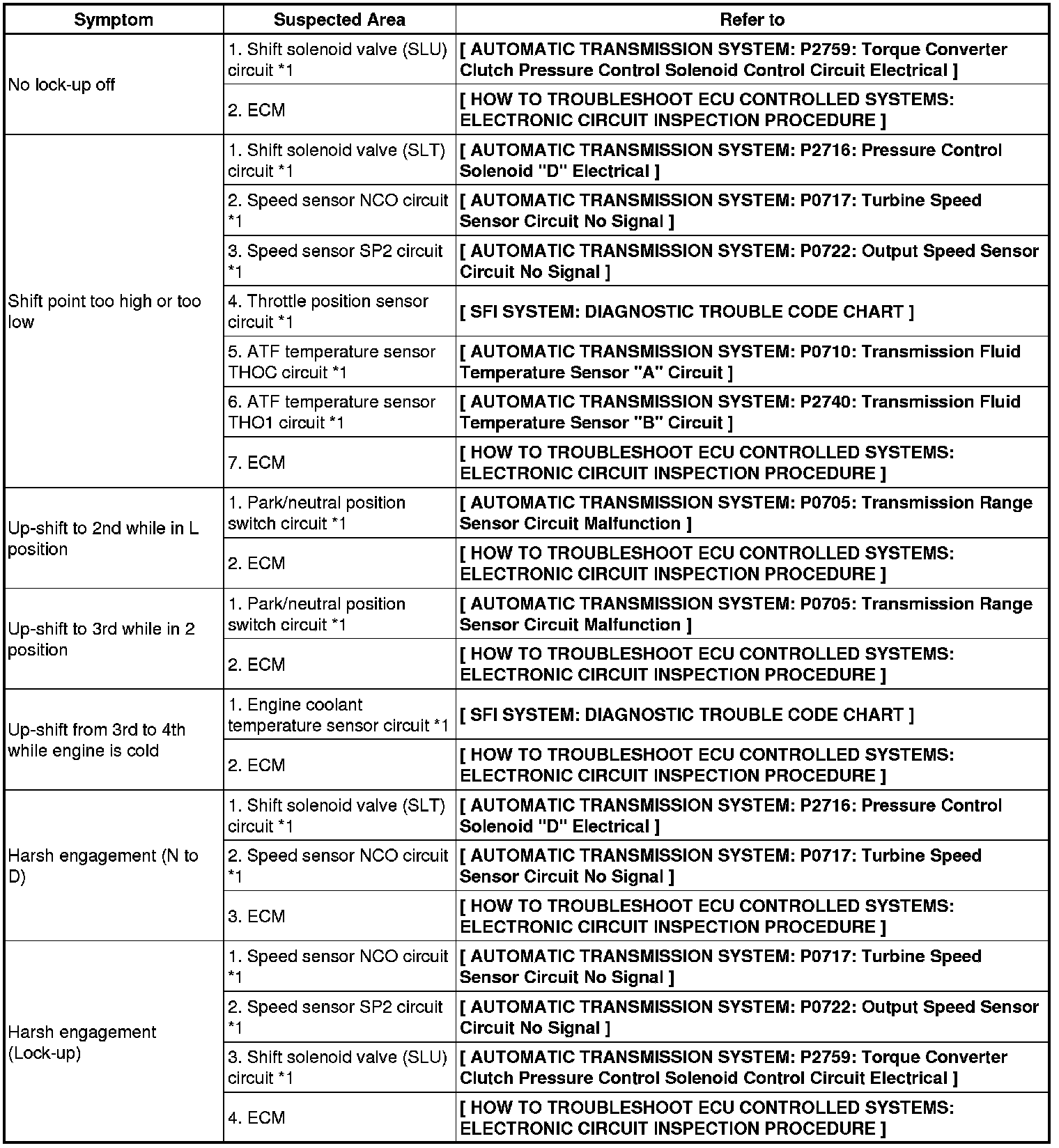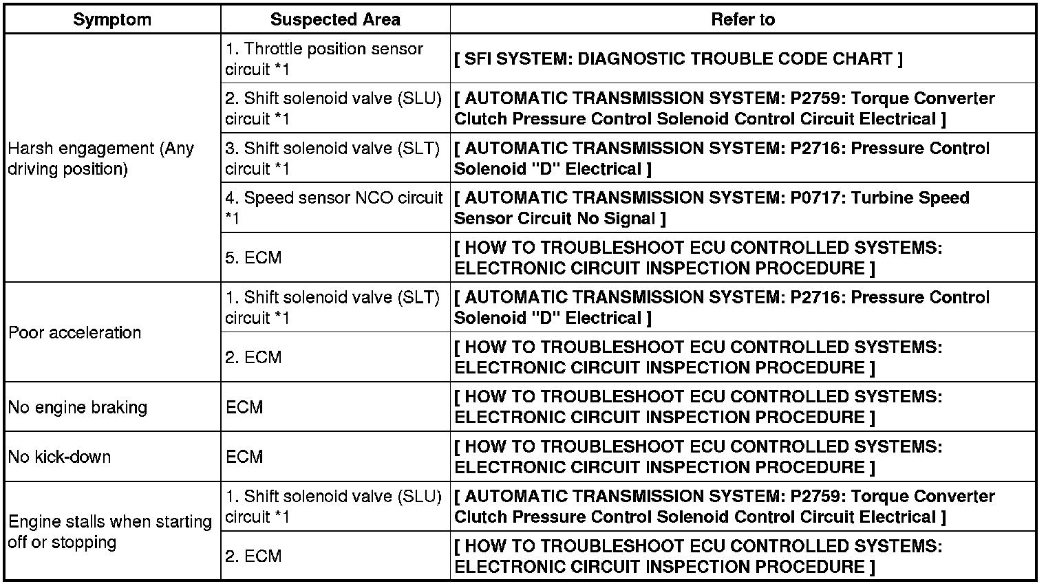 Refer to the table below when the cause of the trouble is considered to be electrical. If the instruction "Proceed to next circuit inspection shown on matrix chart" is given in the flowchart of the circuit, proceed to the next circuit in the table to continue the check. If the trouble still occurs even though there are no abnormalities in any of the other circuits, check the ECM and replace it if necessary.