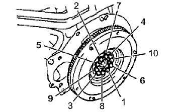 FLYWHEEL SUB-ASSEMBLY (for Manual Transmission)Using several steps, uniformly install and tighten the 10 bolts in the sequence shown in the illustration.