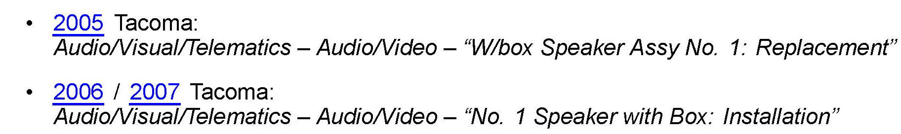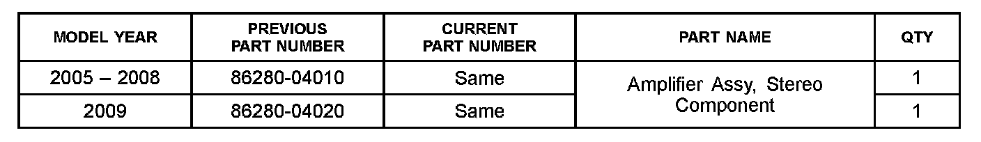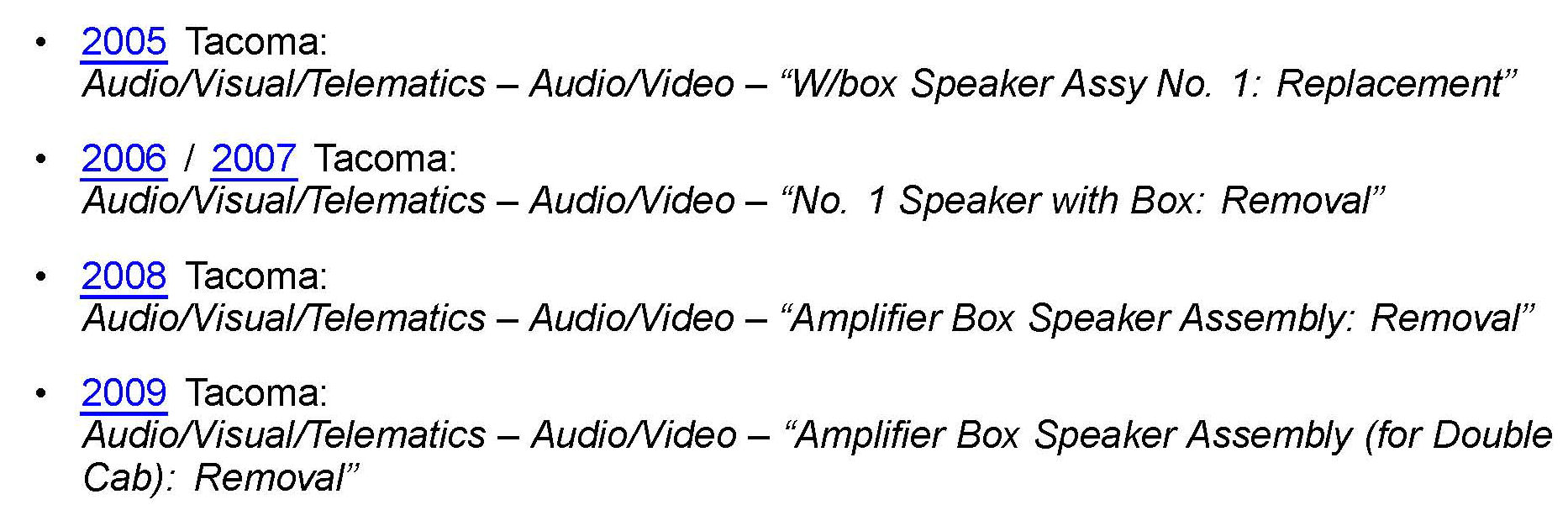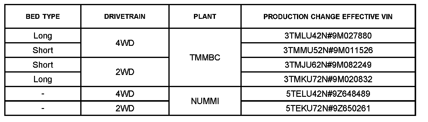 This TSB applies to all 2005 - 2009 Double Cab Tacoma vehicles equipped with JBL subwoofers and produced BEFORE the Production Change Effective VINs shown.