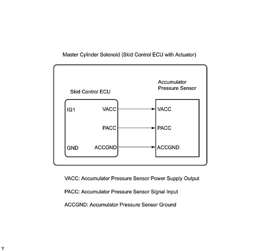 The accumulator pressure sensor is connected to the skid control ECU in the master cylinder solenoid.