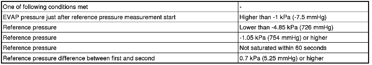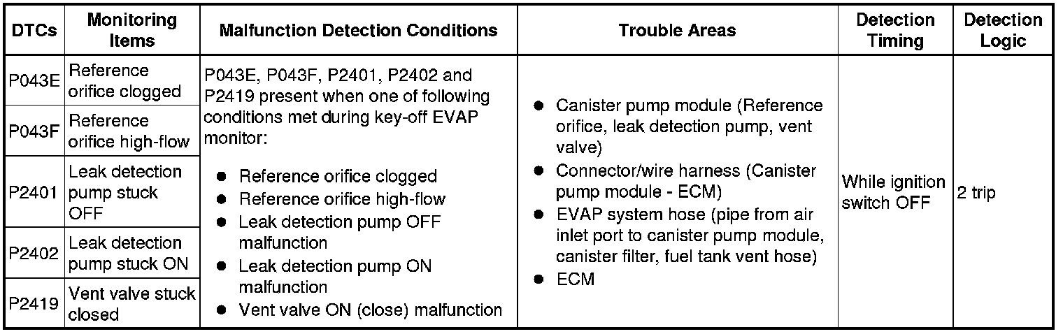 NOTE: If the 0.02 inch leak criterion difference between the first and second checks is greater than the specification, the DTCs corresponding to the leak criterion (P043E, P043F, P2401, P2402 and P2419) will all be stored.