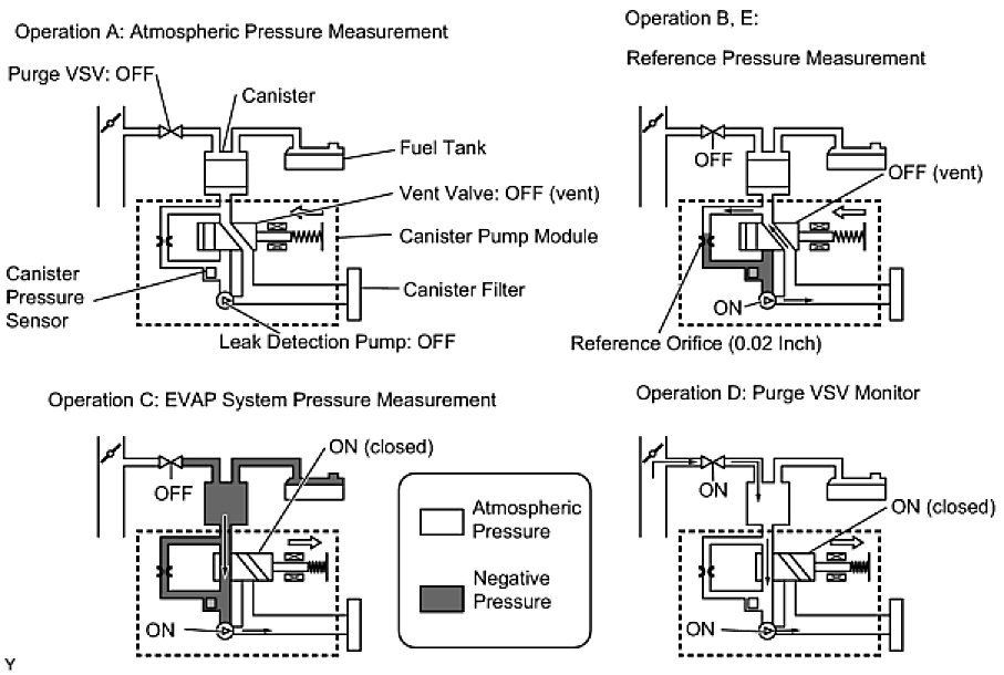 The leak detection pump creates negative pressure (vacuum) in the EVAP system and the pressure is measured. Finally, the ECM monitors for leaks from the EVAP system, and malfunctions in both the canister pump module and purge VSV, based on the EVAP pressure.