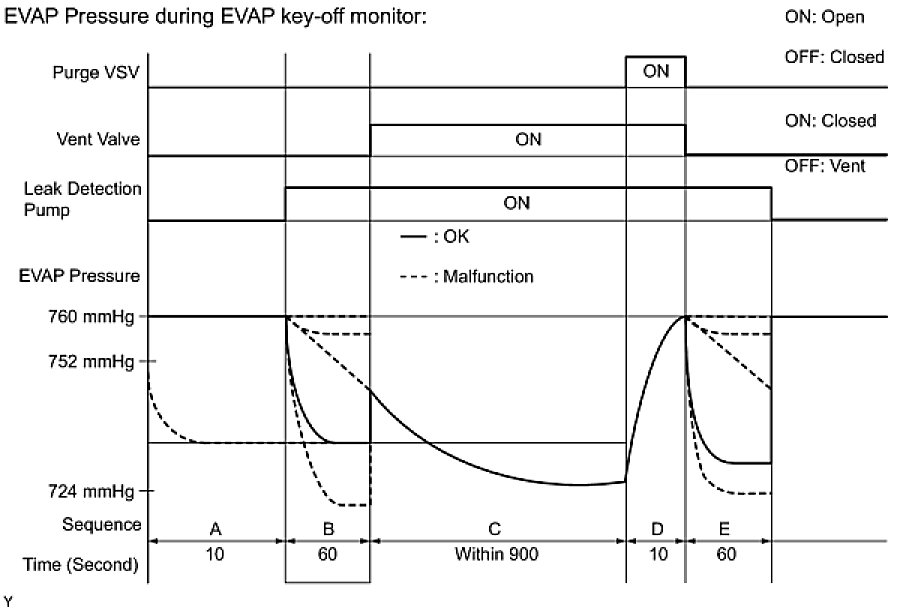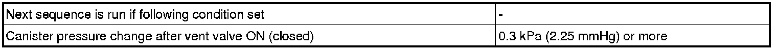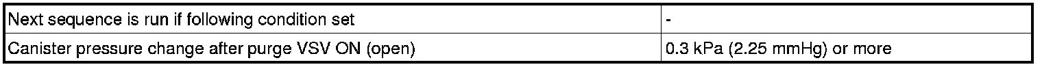 The vent valve is turned OFF (open) and the EVAP pressure is then measured. If the variation in the pressure is less than 0.5 kPa (3.75 mmHg), the ECM interprets this as the purge VSV being stuck closed, and illuminates the MIL and sets DTC P0441 (2 trip detection logic).