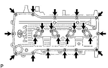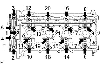 (a) Uniformly loosen and remove the 21 bearing cap bolts and 20 washers on the camshafts in the sequence shown in the illustration.