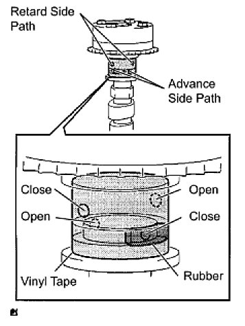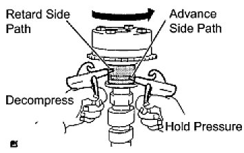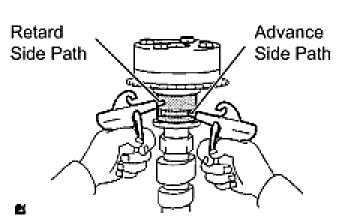 (4) Check that the camshaft timing gear revolves in the advance direction when reducing the air pressure applied to the retard side path.