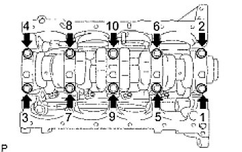 (a) Uniformly loosen the 10 bearing cap bolts, in several steps, in the sequence shown in the illustration.