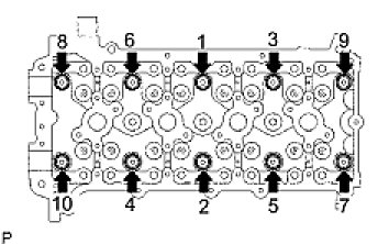 (1) Install and uniformly tighten the 10 cylinder head bolts with the plate washers, in several steps, in the sequence shown.