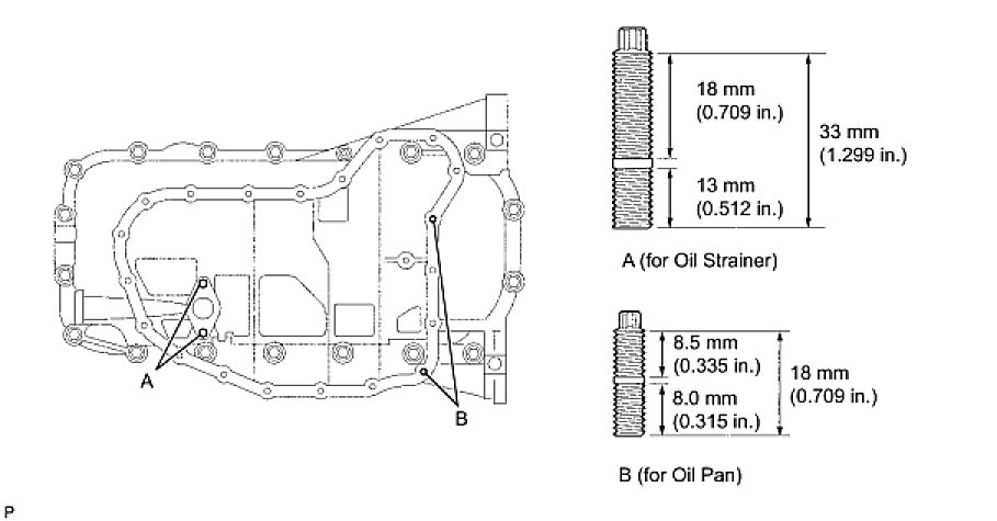 (1) Using an E5 "torx" socket wrench, install the stud bolts labeled A for the oil pan as shown in the illustration.