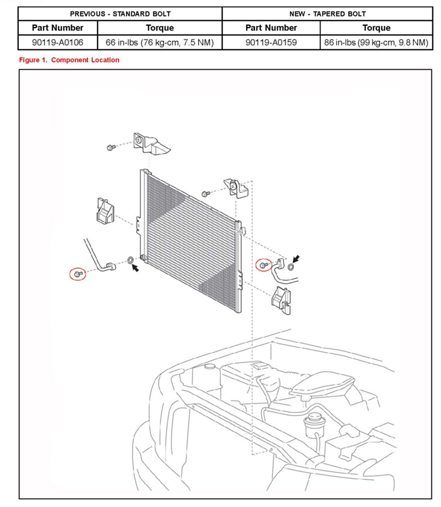 To minimize cross threading of the condenser during assembly the condenser line bolts have been changed to tapered bolts. The tapered condenser line bolts have an increased torque specification. Refer to the table below for the proper torque specifications for the condenser line bolts.