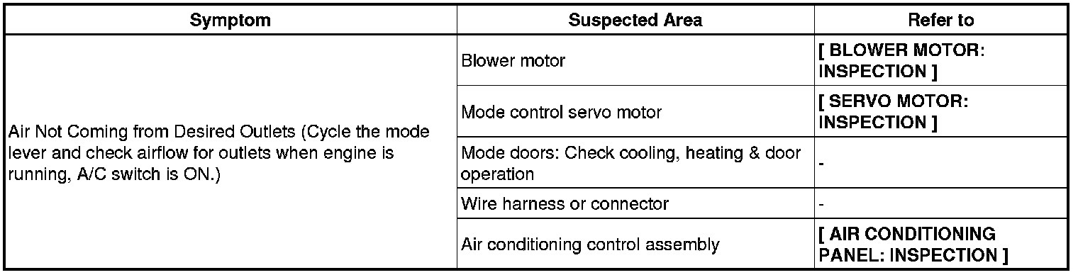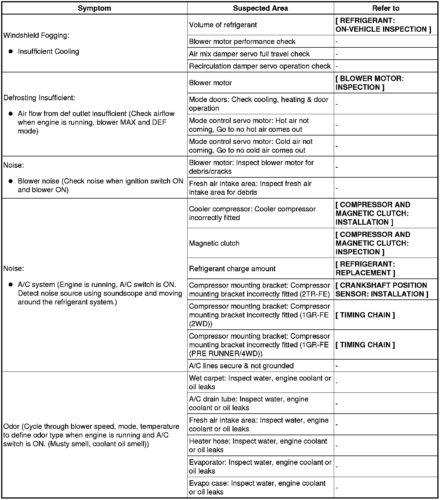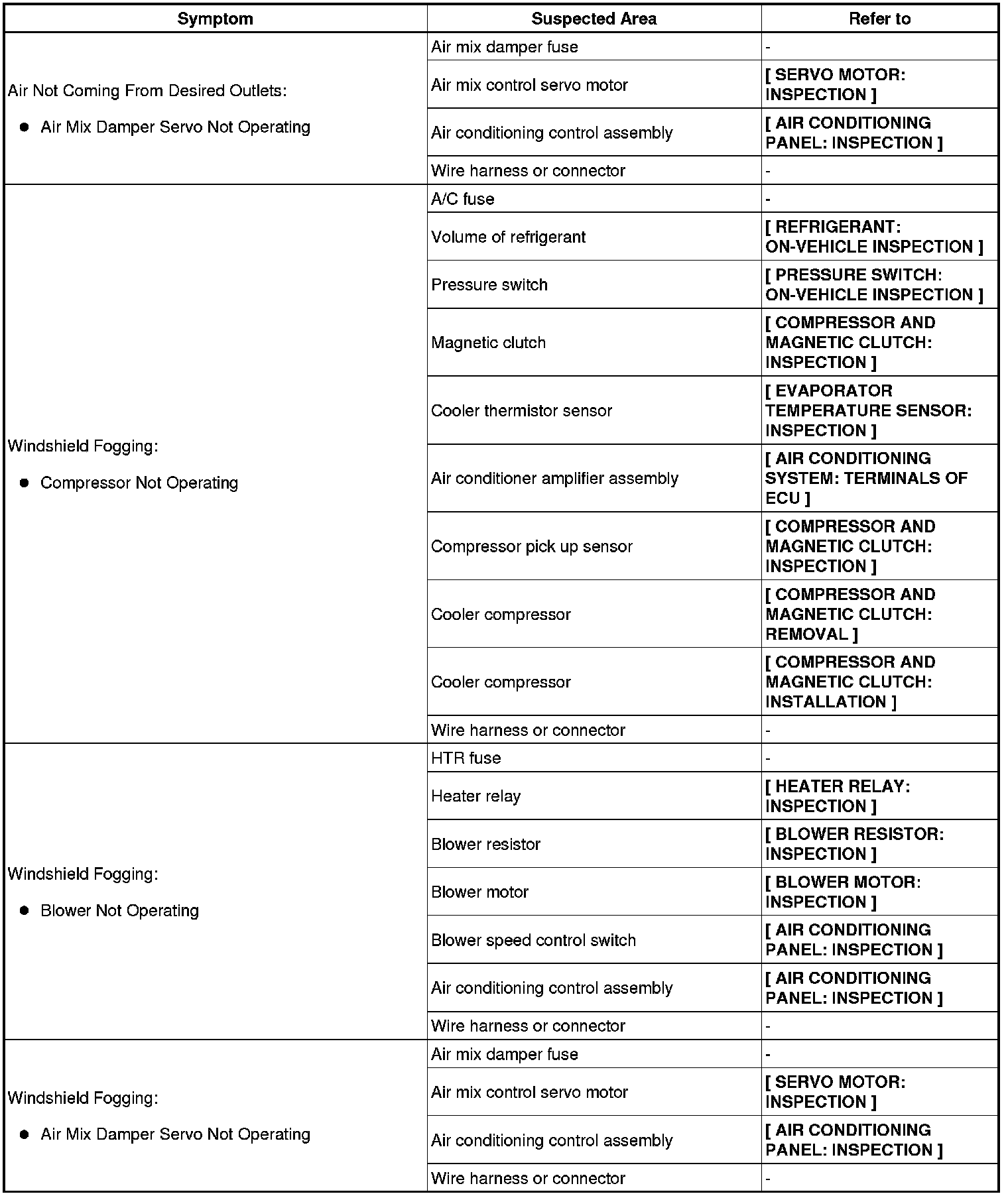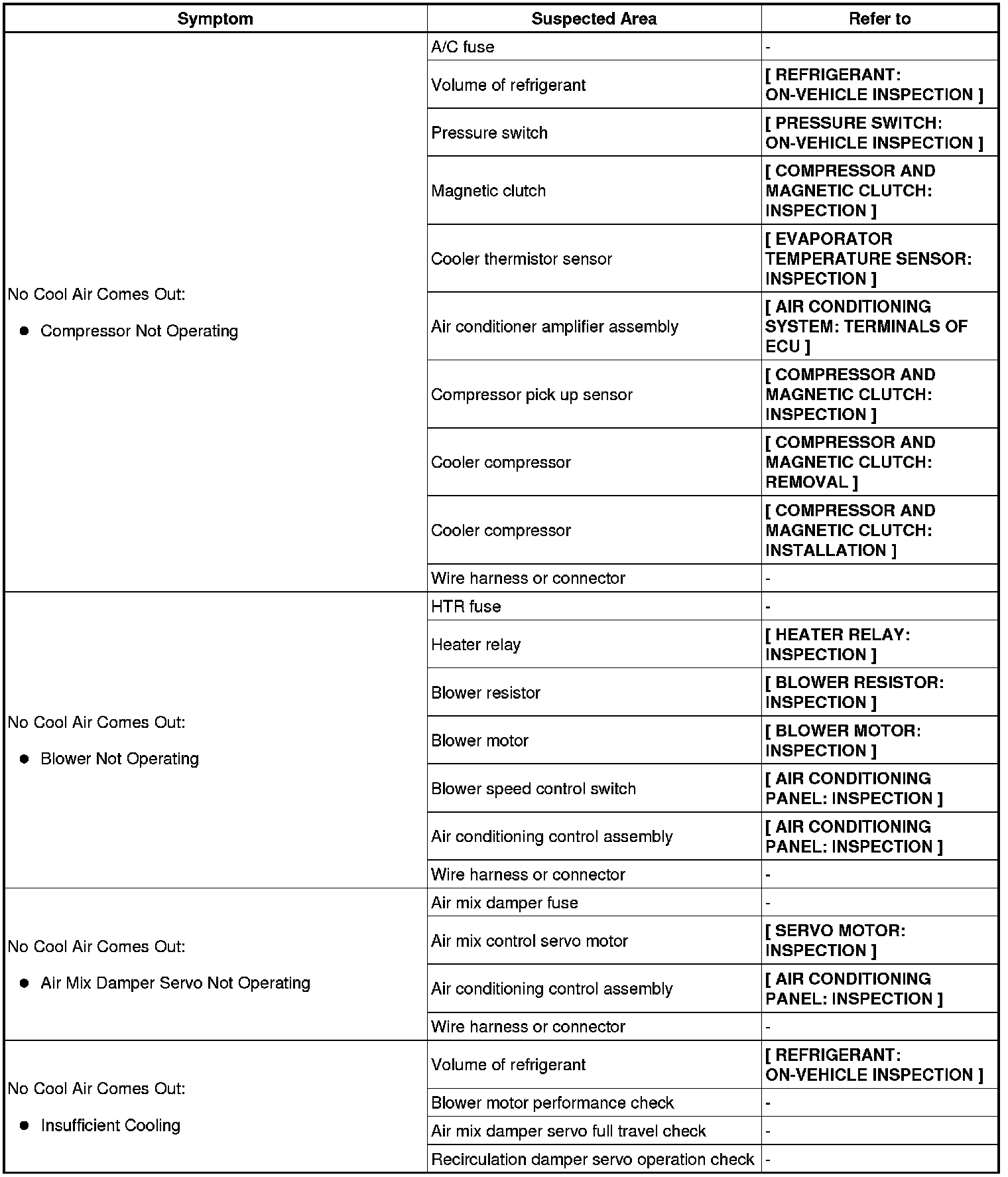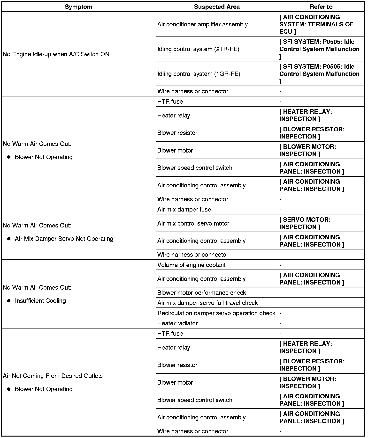 HINT: Inspect the fuses and relays before inspecting the suspected areas shown in the table below.