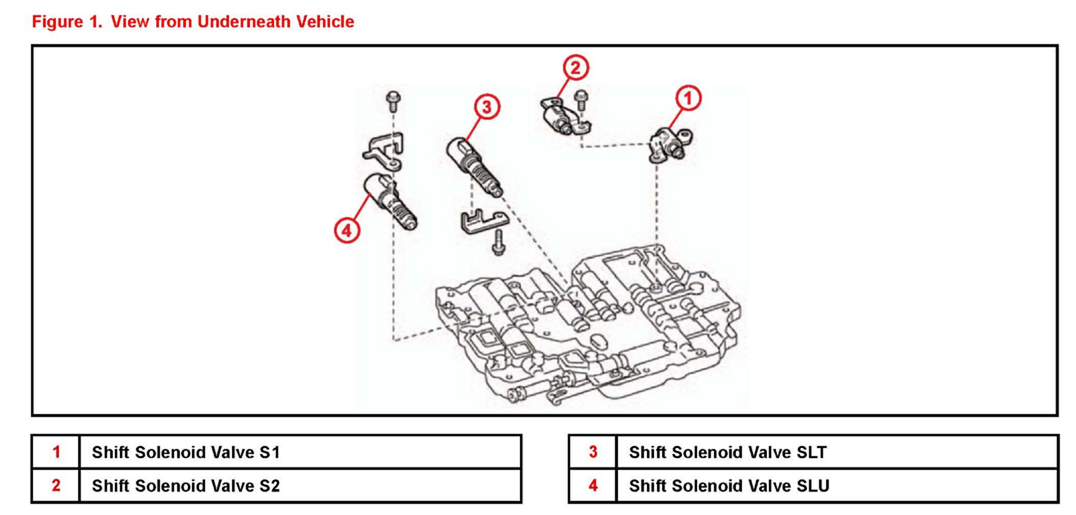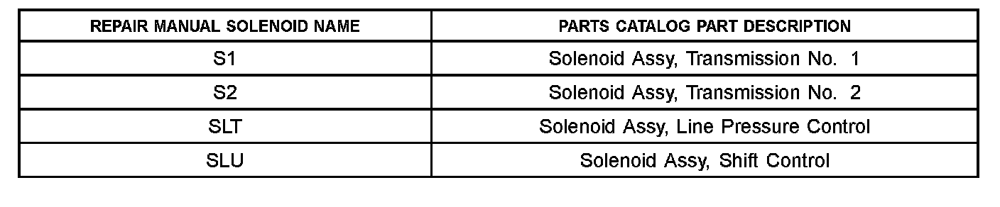 Provided above is a chart listing the Repair Manual name of each solenoid used in the A340E transmission as well as the part name description provided in the electronic parts catalog.