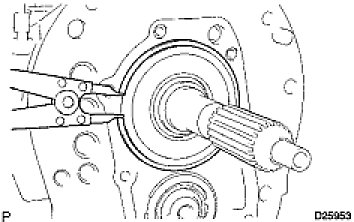 (a) Using a snap ring expander, remove the front bearing shaft snap ring from the transmission case.