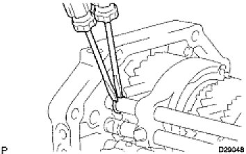 (a) Using 2 screwdrivers and a hammer, remove the shift fork shaft snap ring from the gear shift fork shaft No. 2.