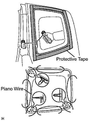 (b) From the interior, insert piano wires between the vehicle body and quarter window, as shown in the illustration.