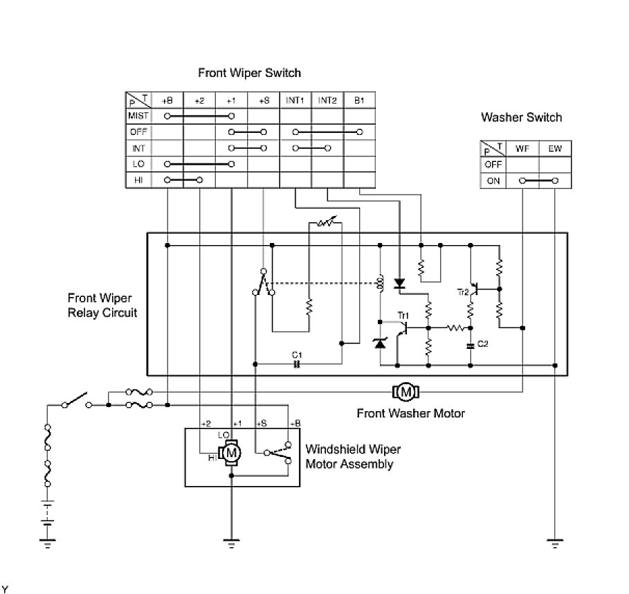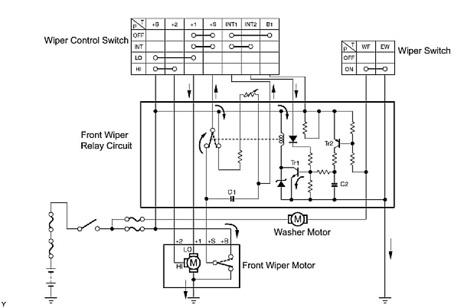 (b) When the wiper control switch is turned to the INT position, current flows from the precharged capacitor C1, through terminals INT1 and INT2 of the wiper control switch, to Tr1 (transistor). When transistor Tr1 is turned on, current flows from terminal +S of the wiper control switch to terminal +1 of the wiper control switch, to terminal +1 of the wiper motor, to the wiper motor and finally to ground, causing the wiper motor to operate. At the same time, current flows from capacitor C1 to terminal INT1 of the wiper control switch and then to INT2. When the current flow from capacitor C1 stops, transistor Tr1 turns off to stop the relay contact point and halts the wiper motor. When the relay contact is off, capacitor C1 begins to charge again and Tr1 remains off until the charging is complete. This period corresponds to the time interval between wiper operations. When capacitor C1 is fully charged, Tr1 turns on and then the relay contact point turns on, causing the motor to operate again. This is the cycle of the intermittent wiper operation. The time interval can be adjusted by using the intermittent time adjust dial (variable resistor) to change the charging time of capacitor C1.