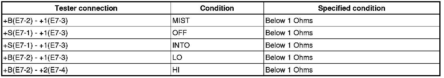 (5) Connect the battery negative lead to terminal 1 (+S) of the E7 connector. Operate the intermittent wiper relay and check the voltage between terminals 3 (+1) of the E7 connector and 2 (EW) of the E11 connector.