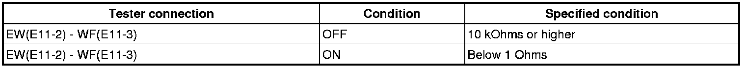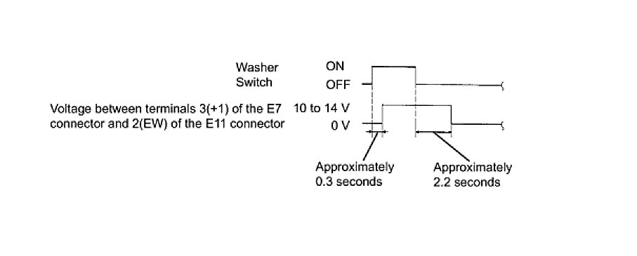 (3) Connect the voltmeter positive terminal to terminal 3 (+1) of the E7 connector and the voltmeter negative terminal to terminal 2 (EW) of the E11 connector. Turn the washer switch on and off, and check the voltage between terminals 3 (+1) of the E7 connector and 2 (EW) of the E11 connector.